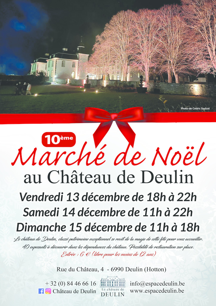 Le 10ème marché de Noël du Château de Deulin aura lieu dans les dépendances et les salons du Château. Produits de bouche, sculptures, bijoux, fantaisie, créations en bois, céramique, vêtements, chapeaux, accessoires, produits de bien-être, antiquités, décorations,...